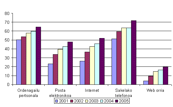 Horrela, telefono mugikorra duten establezimenduak %8,1 puntu gehitu dira, guztirakoaren %71,7ra heltzeraino; Interneterako sarbidea dutenak, aldiz, 6 puntu gehitu dira eta orain erdia baino gehiago dira (zehazki %51,9). Posta elektronikoa %48ak dauka, %5,3 puntu gehitzean, eta establezimenduen %64,5ak ordenagailua dauka, 4,6 puntu gehitzean.