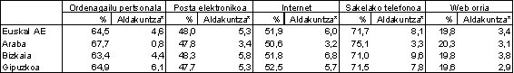 Lurralde Historikoka, datuen arabera Bizkaiak izan du gehikuntzarik handiena (portzentaje-puntutan) posta elektronikoari (5,8), Interneteri (6,8), telefono mugikorrei (9,6) eta webguneei (3,8) dagokienez. Ordenagailu pertsonalen gehikuntzarik handiena Gipuzkoan izan da (6,1). Eta Araban, ekipamendu handienak zituen lurraldea izanik, besteekiko aldea murriztu egin da gehikuntza txikiagoak izan dituelako.