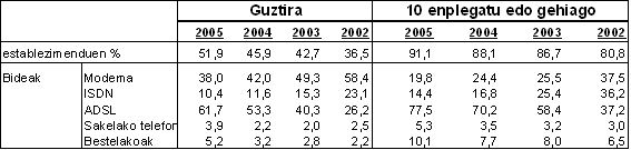 Ohar metodologikoa: EUSTATek 2005eko lehenengo hiruhilekoan (ondoz ondoko bosgarren urtez) egin duen Informazioaren Gizarteari buruzko Inkesta (IGI, enpresak) jarduera-sektore guztietako EAEko enpresentzat da (lehenengo sektorekoak izan ezik); inkestaren helburua hauxe da: enpresa horiek informazioaren eta komunikazioaren teknologietan (IKT) zein ekipamendu duten, Internet nola erabiltzen duten eta merkataritza elektronikoak zenbaterainoko garrantzia duen jakitea. Inkestak, gainera, Euskal Autonomia Erkidegoko 7.500 establezimenduren erantzuna hartu du oinarri gisa.