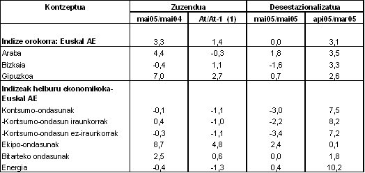 2005eko maiatzeko hil arteko aldaketa, 2005eko apirilaren aldean, positiboa izan zen Ekipamenduko Ondasunei (%2,4) eta Energiari (%0,4) dagokienez. Tarteko Ondasunek, ordea, ez zuten aldaketarik izan (%0,0). Alabaina, Kontsumo-ondasunen hil arteko tasak %3,0 egin zuen behera; horien artean, Kontsumo-ondasun iraunkorrek %-2,2 egin zuten behera eta Kontsumo-ondasun ez iraunkorrek %-3,4.