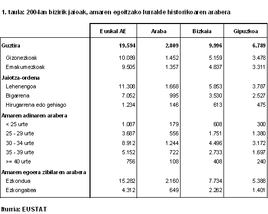 2004. urtean, Euskal Autonomia Erkidegoan guztira 19.594 jaiotza izan ziren, 2003. urtean baino %1,7 gehiago; baina gehikuntza hori 2002 eta 2003 urteen artekoa (%6,3) baino txikiagoa izan zen. 2004. urtean, Araban eman zen gehikuntzarik handiena (%4,3), gero Bizkaian (%1,9) eta azkenik Gipuzkoan (%0,3).