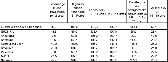 Erkidego ezberdinetako eskolatze-tasak alderatuz gero ikusiko dugu Euskal Autonomia Erkidegoa nagusi dela hezkuntza derrigorrezkoa ez den irakaskuntzetan. Estatuan, lehen hezkuntzan eta derrigorrezko bigarren hezkuntzan biztanleen %100 doa eskolara, Euskadin gertatzen den bezala. Euskadin, gainera, 0-2 urte bitarteko 100 umetik 38 daude eskolan. Goi mailako lanbide heziketa ere bada aukera garrantzitsua gure ikasleentzat; izan ere, 18 eta 19 urteko biztanleen %42ak lanbide heziketako moduluren bat egiten du. Kopuru hori Estatuko batez bestekoa baino 19 puntu handiagoa da.