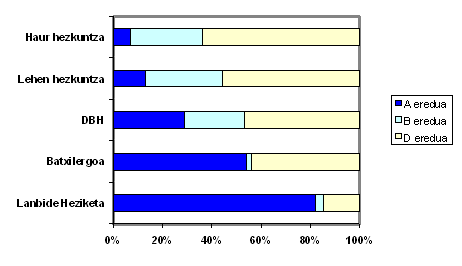 Oro har, oinarrizko irakaskuntzako ikasle gehienek D eredua aukeratu zuten; %26ak A eredua aukeratu zuen eta, azkenik, %23ak B eredua.