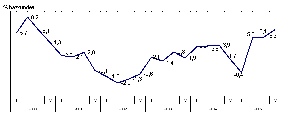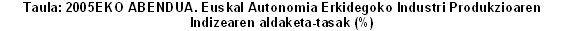 Industriako sektore handi guztiek, kontsumo-ondasun iraunkorrak izan ezik, aldakuntza positiboak izan zituzten urteko metatuan. Ekipamenduko ondasunak %5,7 hazi ziren, energia %3,3, tarteko ondasunak %2,4 eta kontsumo-ondasunak, orokorrean, %0,6. Azken hauen artean, kontsumo-ondasun ez iraunkorrak %1,1 hazi ziren baina kontsumo-ondasun iraunkorrak %0,3 gutxitu ziren. Hori guztia, betiere, 2004. urtearekin erkatuta.