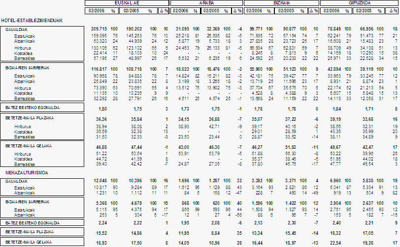 EUSTATen datuen arabera, 2006ko martxoan 152.382 bidaiarik hartu zuten ostatu Euskal Autonomia Erkidegoko hoteletan, hau da, aurreko urteko hilabete berean baino 9.000 gehiagok eta, horrenbestez, %6ko gehikuntza izan da. Bidaiarien sarrera kopurua gehitu egin da Bizkaian (%16) eta Araban (%1), baina Gipuzkoan horien kopurua %4 gutxitu da.