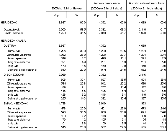 Heriotza eragin zuen arrazoi nagusiena tumoreak izan ziren, 1.286 pertsona hil ziren tumoreengatik (%33,3); heriotzaren bigarren arrazoia zirkulazio-sistemako gaixotasunak izan ziren, hauek 1.082 heriotza eragin baitzituzten (%28). Hirugarren arrazoia arnas gaixotasunak izan ziren, 319 pertsona hil zirelako arrazoi horrengatik (%8,2).