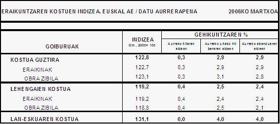 Martxoan, prezioaren hazkunde handienak, besteak beste, petrolioaren eratorrietan (%2,6), asfaltozko produktuetan (%2,6), beiran (%2,3), energia elektrikoan (%1,9) eta burdina eta altzairuan (%1,9) kontsumitutako lehengaietan eman ziren. Ondoko hauetako lehengaien prezioak, berriz, gutxitu egin ziren: karea, igeltsua eta eskaiola (%-2,9), metalezko tutueriak (%-0,6), zementu artifiziala (%-0,5), beste gai metaliko batzuk (%-0,4) eta egiturak eta galdaragintza (%-0,2).