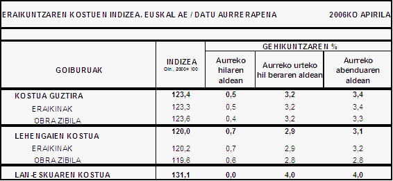 Apirilean, prezioen hazkunde handienak, besteak beste, ondoko hauetan kontsumitutako lehengaietan eman da: lehergailu eta gasak (%5,7), petrolioaren eratorriak (%4,9), asfaltozko produktuak (%4,9), burdina eta altzairua (%2,6), burdindegiko gaiak (%1,6) eta beirak (%1,4). Ondoko hauetako lehengaien prezioak, berriz, gutxitu egin dira, besteak beste: energia elektrikoa (%-1,7), egiturak eta galdaragintza (%-0,8), metalezko tutueriak (%-0,3) eta erauzketa-agregakinak (%-0,1).