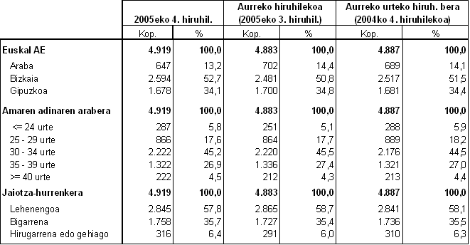 EUSTATen datuen arabera, 2005eko laugarren hiruhilekoan 4.919 ume jaio ziren Euskal Autonomia Erkidegoan, hau da, aurreko urteko aldi berean baino %0,7 gehiago. Horietatik, 1.593 ume urrian jaio ziren, 1.632 azaroan eta 1.694 abenduan. Lurraldeka, Araban 647 ume jaio ziren, Bizkaian 2.594 eta Gipuzkoan 1.678.
