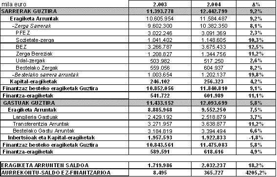 EUSTATen datuen arabera, euskal administrazioen gastu arruntak (Eusko Jaurlaritza, foru aldundiak, udaletako administrazioak, erakunde autonomoak eta udalaz gaineko erakundeak) %7,5 gehitu ziren 2004ko kontabilitate-ekitaldian. 2004ko ekitaldi horretan, guztira 9.552,2 milioi euroko gastua (%+5,8) eta 11.584,4 milioi euroko sarrera arruntak izan ziren; beraz, tasa hori urtean %9,2 igo da.
