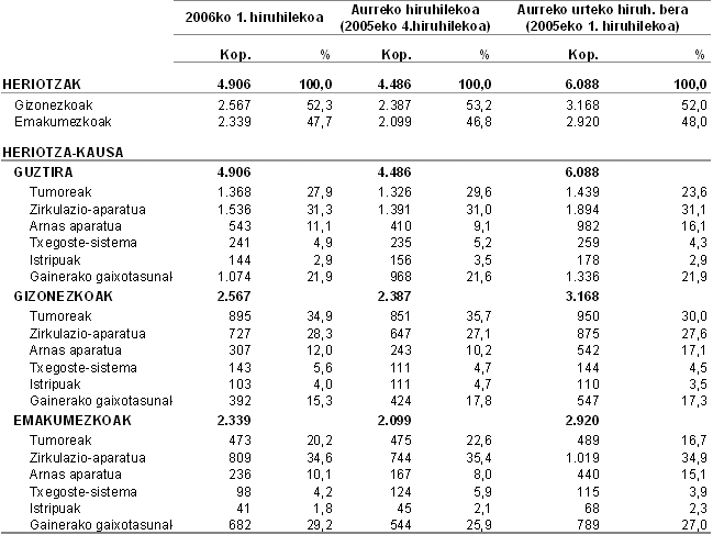 EUSTATen datuen arabera, 2006ko lehen hiruhilekoan 4.906 pertsona hil ziren Euskal Autonomia Erkidegoan, hau da, aurreko urteko denboraldi berean baino %19,4 gutxiago. Lurraldez lurralde, Araban 594 pertsona hil ziren (%19,3ko gutxipenarekin), Bizkaian 2.733 (-%18,8) eta Gipuzkoan 1.579 (-%20,5).
