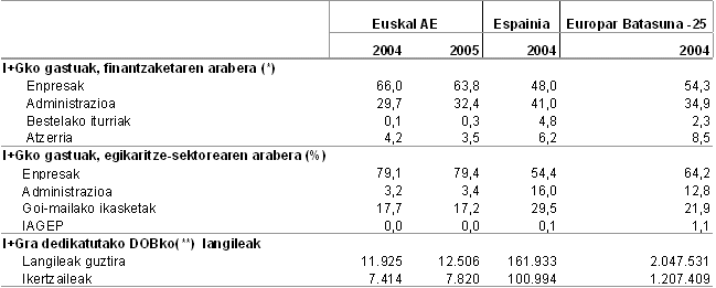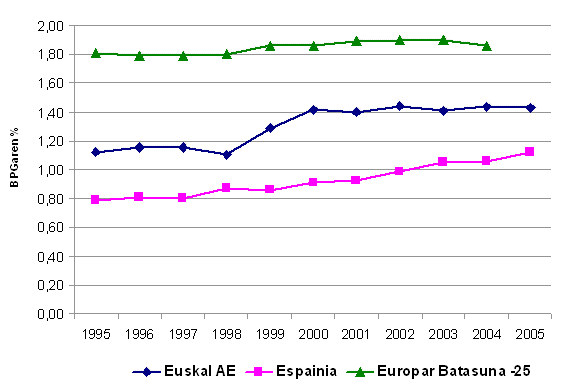 2005eko I+Gko barne-gastuak BPGaren %1,43 hartzen du, eta, beraz, estatuko batez bestekoaren gainetik dago (2005. urtean %1,12), baina Europar Batasuna-25eko batez bestekoaren azpitik (2004an %1,86). Euskal AEko hazkunde nominal handiak direla-eta, ehuneko hori egonkortuta dago azken urteetan.