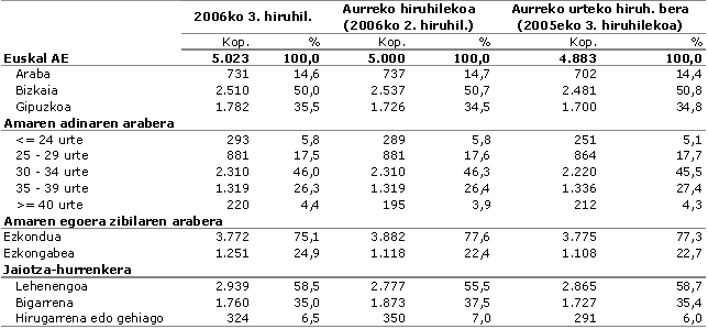 Eustaten datuen arabera, 2006ko hirugarren hiruhilekoan 5.023 ume jaio ziren Euskal Autonomia Erkidegoan, aurreko urteko hiruhileko berean baino %2,9 gehiago. Lurraldeka, Araban 731 ume jaio ziren (aurreko urteko aldi berean baino %4,1 gehiago) Gipuzkoan 1.782 ume jaio ziren (%4,8 gehiago) eta Bizkaian gehikuntzarik txikiena eman zen, 2.510 jaiotza (%1,2 gehiago).