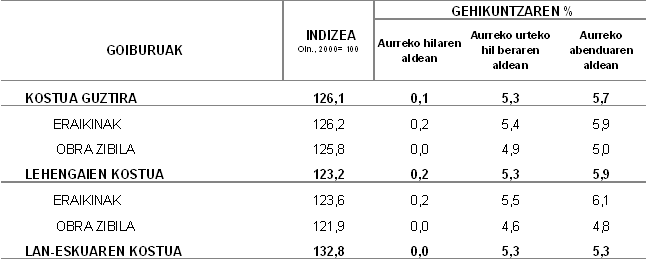 Sektoreak kontsumitutako lehengai garrantzitsuen artetik, azken hamabi hilabeteetan, hauek izan dituzte inflazio-tasarik handienak: energia elektrikoa (%23,5), burdina eta altzairua (%18,0), metalezko hoditeria (%15,2), beira (%12,7), eta zementu artifiziala (%5,1). Bestalde, urte arteko prezioetan (2006ko azaroa, 2005eko azaroarekin alderatuta) honako lehengai hauek izan dituzte jaitsierak edota igoera txikiagoak: petroliotik eratorriak (%-3,8), asfalto-produktuak (%-0,1), zeramika-produktuak (%-0,1), harri elaboratua (0,3), karea, igeltsua eta eskaiola (%0,6), eta egurra eta kortxoa (%0,9).