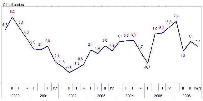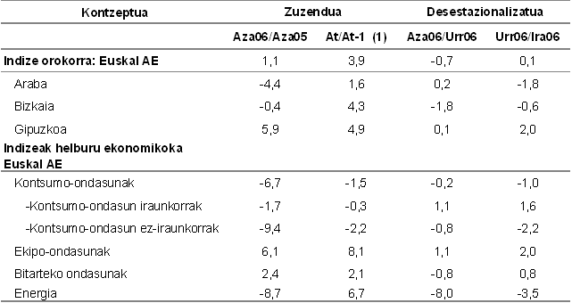 Sektoreka, industri sektore handien sailkapena kontuan hartuta, 2006ko azaroko indizearen bilakaerak honako aldakuntzak izan zituen, 2005eko azaroaren aldean: Ekipo-ondasunak %6,1 hazi ziren eta Bitarteko ondasunak %2,4 igo ziren. Aitzitik, Energiak (%-8,7) eta Kontsumo-ondasunek (%-6,7) behera egin zuten, Kontsumo-ondasun iraunkorrek (%-1,7) eta Kontsumo-ondasun ez-iraunkorrek (%-9,4) izandako jaitsieren eraginez.