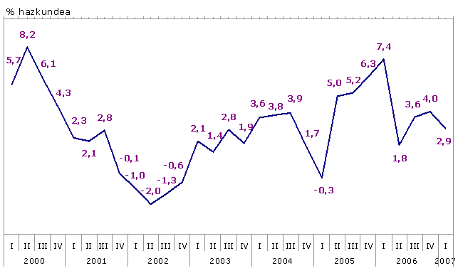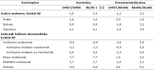 Sektoreen arabera, eta industri sektore nagusiak sailkatu ostean, 2007ko urtarrileko indizearen bilakaera hazi egin da ekipamenduen ondasunetan (%7,7) eta tarteko ondasunetan (%3,7), 2006ko urtarrilaren aldean. Energia %4,4 gutxitu da eta kontsumo-ondasunak %0,9, hauek kontsumo-ondasun iraunkorren (%-3,3) gutxitzearen ondorioz; kontsumo-ondasun ez iraunkorrak, aitzitik, %0,4 gehitu dira.
