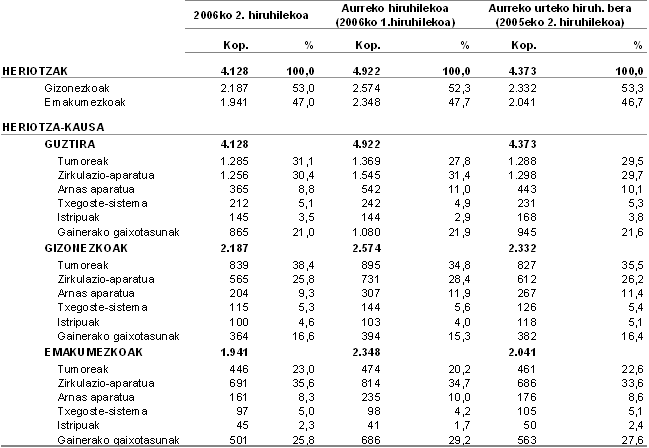 Heriotzen kausak ez ziren berdinak izan sexu batean eta bestean: gizonezkoen artean, tumoreak (%38,4) hilgarriago gertatu ziren zirkulazio-aparatuko gaixotasunak (%25,8) baino; emakumezkoen artean, berriz, heriotza-kausa nagusia gaixotasun kardiobaskularrak (%35,6) izan ziren, eta tumoreak (%23) bigarren.