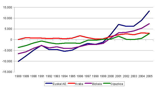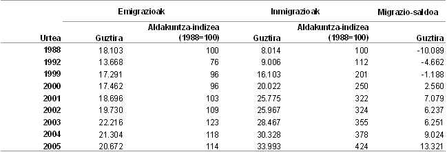 Atzerriko nazionalitatea dutenen inmigrazioak, 2005. urtean, 19.877 pertsonakoak izan ziren, hots, gure erkidegora etorritako guztien %58 izan ziren. 2000. urtean erregistratu ziren berriz migrazio-saldo positiboak, eta harrezkero nabarmen gehitu dira atzerriko nazionalitatea duten etorkinen sarrerak Euskal Autonomia Erkidegoan. Kopuru absolututan, 7.328 sarreratik 20.000 ingurura igo zen 2005. urtean, hau da, atzerritarren inmigrazioak ia hiru aldiz gehiago izan ziren azken bost urteetan. Kontuan izan behar da atzerriko etorkinetatik zenbait beste autonomia erkidego batzuetatik etorri direla. Zehazki, 2005. urtean 5.093 kasutan gertatu zen hori.