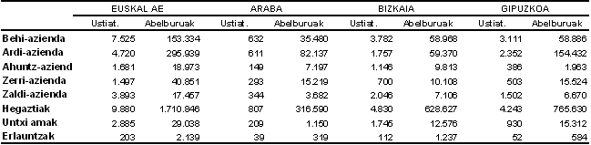 Euskal AEko ustiategiak 2003ko 22.234 izatetik 2005eko 21.730era pasa dira, hau da, %2,3 gutxiago. Nekazaritzako azalera guztia zein nekazaritzako azalera erabilia (lur landuak eta larre iraunkorretarako lurrak) apenas aldatu dira 2003. urtearen aldean: %0,5 gehitu dira lehenengoak eta %0,5 gutxitu bigarrenak, Eustatek landutako datuen arabera.