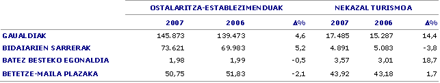 4.891 bidaiarik nekazalturismoak aukeratu dituzte, 2006ko aldi berean baino %3,8 gutxiago. Guztira 17.485 gau igaro dituzte nekazalturismoetan, aurreko urtean baino %14,4 gehiago. Igarotako gau kopuruak etorritako bidaiari kopuruak baino bilakaera hobea izatearen arrazoia bidaiari bakoitzaren batezbesteko egonaldia handitu izana da; izan ere, batezbesteko egonaldiak luzatu dira: aurreko urtean 3,01 eguneko egonaldiak ziren eta aurtengo Aste Santuan 3,57 egunekoa. Nekazalturismoetan plazen okupazioa pixka bat handitu da, %1,7, hain zuzen ere.