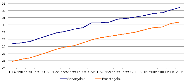 Ama izateko adinak gora egin duen neurrian, ezkontzeko adinak ere hala egin du. 2005ean, ezkondu ziren gizonezko ezkongabeen batez besteko adina 32,4 urte zen, eta emakumezkoena, berriz, 30,4. 1986. urtetik, senargaien batez besteko adina 5 urte igo da eta emaztegaiena 5,5.