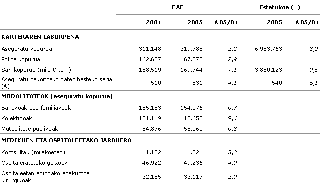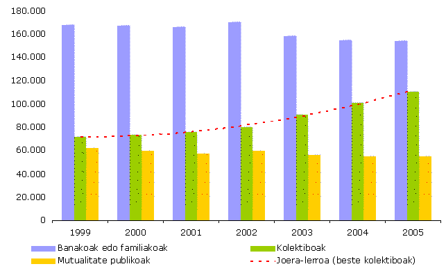 Banakako edo familiako modalitateak izan zuen aseguratu gehien (%48,2), gero aseguru kolektiboek (enpresak edo beste talde zehatz batzuk) %34,6arekin eta azkenik mutualitate publikoak (%17,2). 2004. urtearen aldean, aseguru kolektiboetan hazi da gehien asegurudun kopurua, %9,4ko gehikuntzarekin, estatuan gertatu den hazkundearen antzekoa (%9,9). Bestalde, mutualitate publikoek aseguratutako kolektiboak ere gora egin du zertxobait (%0,3). Norbanako edo familiako asegurua duten pertsona kopuruak behera egin du (-%0,7).