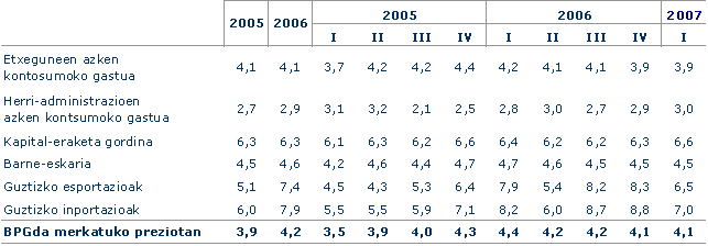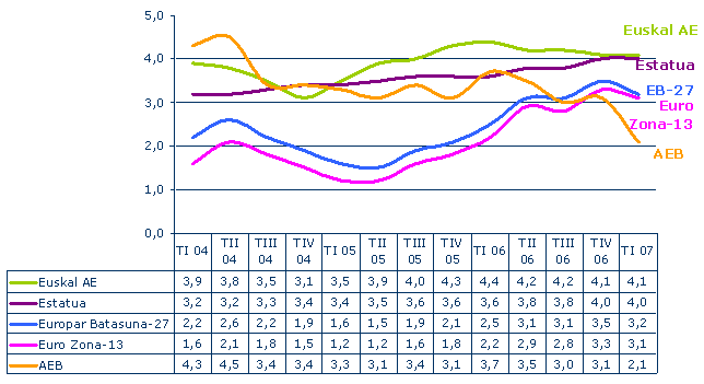 Zerbitzuen Sektorean hamarren bateko hazkundea dugu lehengo hiruhilekoaren aldean, tasa %3,7koa delarik. Bestalde, Merkatuko Zerbitzuetan urte arteko %3,9ko hazkundea dugu, 2006ko laugarren hiruhilekoan baino hamarren bat gehiago; halere, hiruhilekoen arteko profila %1,2tik %0,5era pasatzen da. Ez-Merkatuko Zerbitzuetan urte arteko goranzko bilakaera dugu, %2,8koa; baina hiruhilekoen arteko tasetan beheranzkoa, lehengoan %1,2 eta oraingoan %0,3.