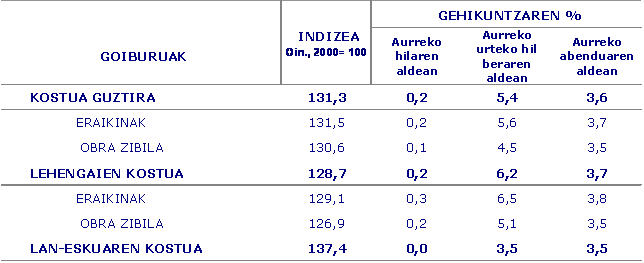 Ekainean, prezioen hazkunde handienak, besteak beste, ondoko hauetan kontsumitutako lehengaietan eman dira: kare, igeltsu eta eskaiolan (%4,9), lehergailu eta gasetan (%2,1), metalezko tutuerian (%1,4) eta petrolioaren eratorrietan (%1,2). Ondoko hauetako lehengaien prezioak, berriz, gutxitu egin dira, besteak beste: energia elektrikoa (%-2,8), pinturak eta bernizak (%-0,1), erauzketa-agregakinak (%-0,1) eta gailuak eta material elektrikoa (%-0,1).