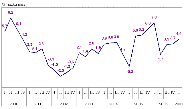 Sektoreen arabera, eta industri sektore nagusiak sailkatu ostean, 2007ko otsaileko indizearen bilakaera hazi egin da ekipamenduen ondasunetan (%14,6) eta tarteko ondasunetan (%6,1), 2006ko otsailaren aldean. Aitzitik, energia %10,1 gutxitu da eta kontsumo-ondasunak %1,1, hauek kontsumo-ondasun ez iraunkorren (%-3,4) gutxitzearen ondorioz; kontsumo-ondasun iraunkorrak, aldiz, %3,7 gehitu dira.