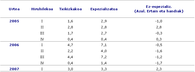 Txikizkako merkataritza espezializatuan, urte arteko hazkundeko tasarik handiena elikaduraren sektoreari dagokio. % 6,4ko hazkunde nominala izan du; termino errealetan, % 2,7koa. Etxearen hornikuntzako ondasunek ere hazkunde nabarmena izan dute; horien hazkundea % 5,3koa izan da termino nominaletan; tasa hori, termino errealetan, % 4,0koa da (positiboa hau ere). Pertsonen hornikuntzarako produktuen salmentak % 3,9 gehitu dira euro arruntetan; termino errealetan, hazkundea % 2,9koa izan da. Beste alde batetik, Bestelako Kontsumo Ondasunen partidak (kirolak, jolasak, optikak eta liburu-dendak, besteak beste) % 3,2ko hazkunde nominala izan du; produktu horien prezioen deflazio-efektuaren ondorioz, ordea, termino errealetan, tasa hori % 3,5 bihurtu da.