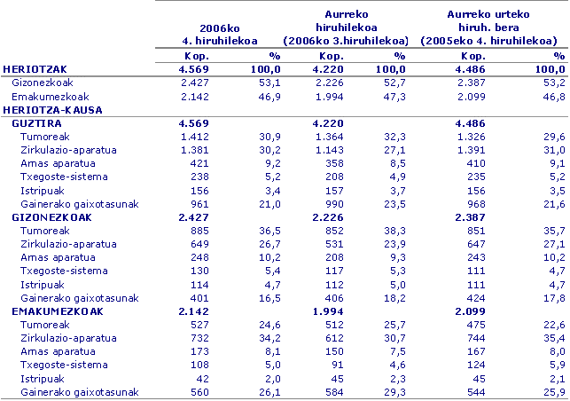 2006ko laugarren hiruhilekoan, Euskal AEn 4.569 lagun hil ziren, iazko aldi berean baino %1,9 gehiago, EUSTATen datuen arabera. Lurraldez lurralde, Araban 577 lagun hil ziren, Bizkaian 2.568, eta Gipuzkoan 1.424.