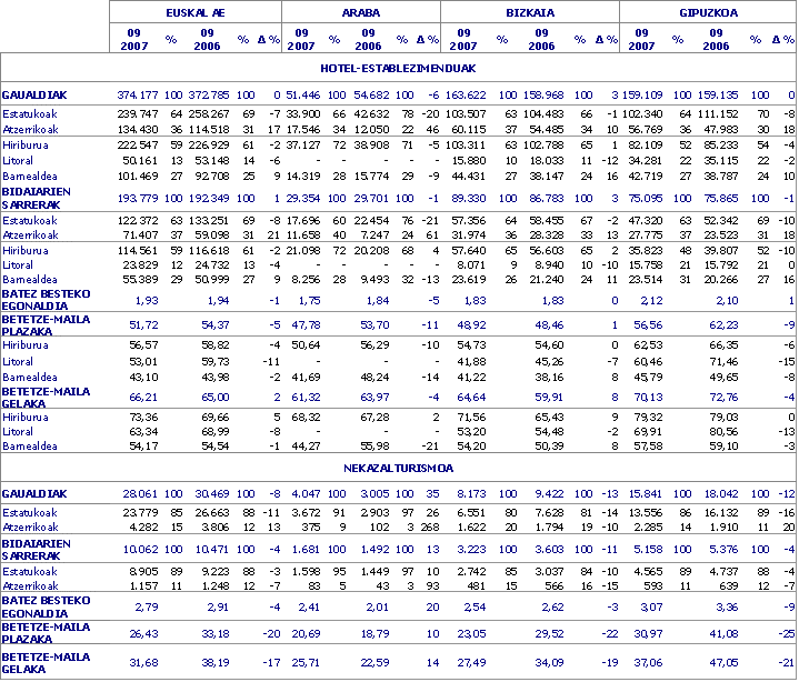 2007ko irailean, Eustatek eskainitako datuen arabera, 193.779 bidaiari-sarrera erregistratu ziren Euskal AEko hotel-establezimenduetan, aurreko urteko hil berean baino 1.400 sarreratik gora gehiago, hau da, %1eko gehikuntza. Bidaiarien sarrerak gehitu egin ziren Bizkaian (%3), baina jaitsi Araban eta Gipuzkoan (%-1), 2006ko iraileko datuen aldean.