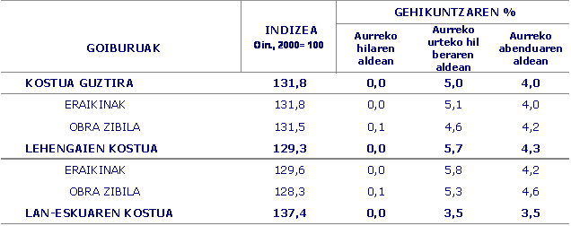 Abuztuan, prezio hazkunderik handienak kontsumitutako honako lehengaiek izan zituzten: energia elektrikoa (%4,0), beira (%2,3), ateratze agregakinak (%0,6), zementu artifiziala (%0,5) eta metalezko hoditeria (%0,5), besteren artean. Aitzitik, beste lehengai batzuen prezioak jaitsi egin dira, hala nola petroliotik eratorritakoak (%-1,9), asfaltoproduktuak (%-1,5) karea, igeltsua eta eskaiola (%-1,4), leherkariak eta gasak (%-1,1) eta burdina eta altzairua (%-0,5) lehengaienak besteak beste.