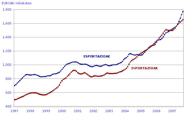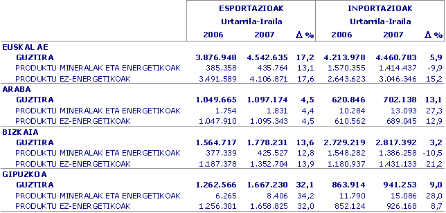 Europako Batasunera egindako esportazioek urte arteko %7,2ko hazkundea izan dute, esportazio guztien batez bestekoaren (%17,2) azpitik, gure esportazioak doazen herrialdeetako tasa txikiagoen ondorioz. Frantziara egindako esportazioak %6,0 igo ziren; Alemaniarakoak %2,5. Italiarakoak %-1,6 eta Erresuma Baturakoak %-0,2; jaitsiera apalak, beraz. Portugalek (%15,2), Belgikak (%31,7) eta Herbehereek (%26,3) tasa positiboak eta altuagoak izan zituzten esportazioetan. Europako Batasunetik kanpo India (153,0%), Brasil (35,0%) eta Txinako (29,1%) hazkundeak nabarmentzekoak dira. Europar Batasunetik etorritako inportazioak %7,3 hazi ziren: Alemaniatik (%8,2), Frantziatik (%2,5), Erresuma Batutik (%3,5) eta Italiatik (%19,5).