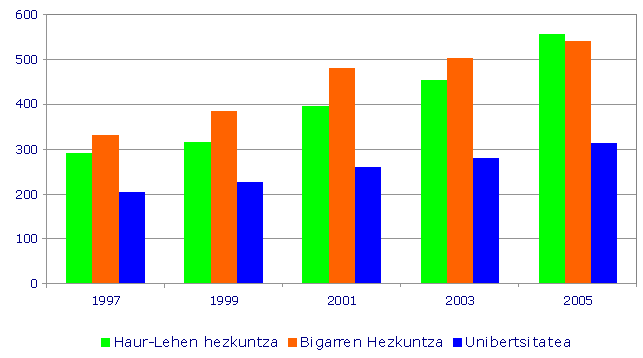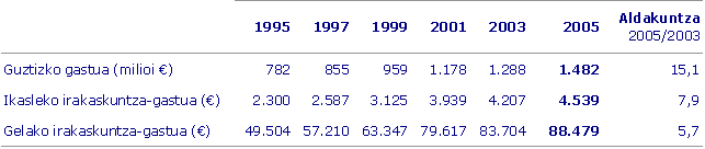 Gastuaren zatirik handiena, hots, %91 jarduera arruntak ordaintzeko erabili zen, eta gainerako %9 inbertsioetarako. Gastu arrunta 1.349 milioi eurokoa izan zen eta honela banatu zen: %93,4 zuzenean irakaskuntzarako (horren barruan, kapitulurik garrantzitsuena langileria-gastuak hartu zuten, %88 hain zuzen); %1 jarduera osagarrietarako, eta %5,6 batez ere jantokiko eta eskola-garraioko zerbitzuko osagarrietarako.