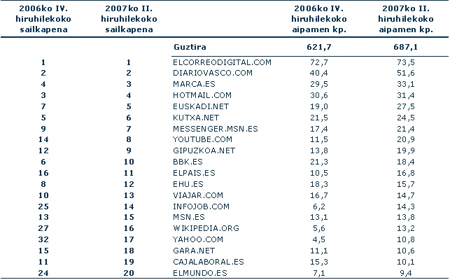 Nabarmentzekoa da “youtube.com” orriaren aurrerapena sailkapenean, 14.enetik 8.enera; halaber, lehenengo 20en artean sartu dira “wikipedia.org” eta “infojob.com”; aurrenak 13.200 aipatze ditu, lehengo hiruhilekoa baino bi aldiz gehiago pasa, eta bigarrenak 13.800, 16. jartzen delarik.