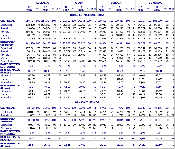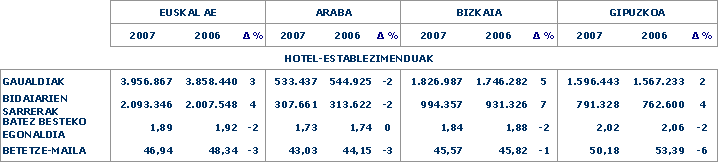Euskal Autonomia Erkidegoko hotel-establezimenduen 2007ko balantzea gehikuntzekin itxi zen, bai bidaiarien sarrerei (%4) bai igarotako gau kopuruari (%3) dagokienez, betiere aurreko urtearen aldean.