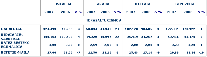 2007. urtean 2.093.346 bidaiari etorri dira, hau da, aurreko urtean baino 86.000 gehiago; horrela, ondoz ondoko bigarren urtez gainditu da Euskal Autonomia Erkidegoko hotel-establezimenduetan ostatua hartu zuten milioi biko bisitarien kopurua. Bizkaian %7 gehitu da etorritako bidaiari kopurua eta Gipuzkoan %4; alabaina, Araban %2 gutxitu da kopuru hori.