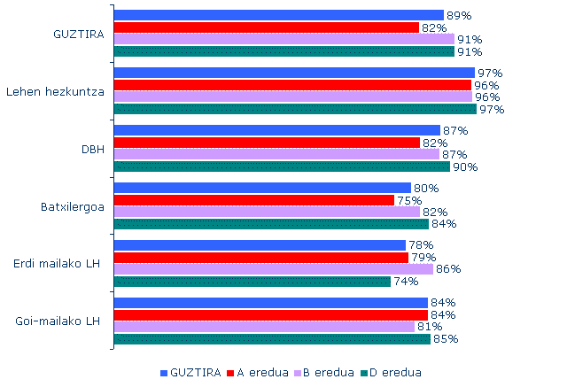 Hizkuntz ereduaren arabera, guztirakoaren portzentajearen (%89) gainetik B eta D ereduak izan ziren, biak %91rekin A ereduko zentroetan %82 izan ziren gainditutakoak.