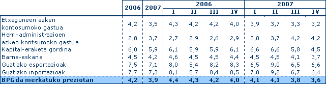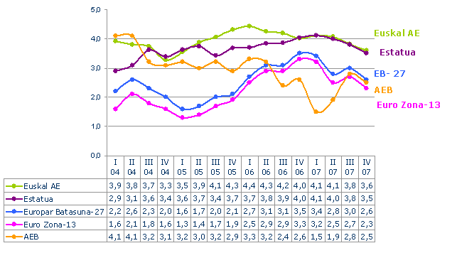 2007ko laugarren hiruhilekoan, aurreko urteko hiruhileko berberaren aldean, Euskal AEko BPGk moteldu egin du ordura arteko hazkunde nabarmena, tasa erreala %3,6 izan da, aurreko hiruhilekoko urte arteko tasa baino ehuneko bi hamarren gutxiago. Tasa hau ere Espainiako ekonomian lortu dena (%3,5) baino hamarren bat handiagoa da, EB-27rena (%2,6) baino puntu bat gehiago eta Estatu Batuetan lortutakoa (%2,5) baino puntu bat baino gehiago handiagoa.
