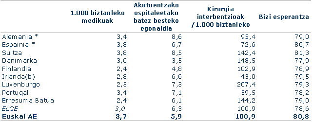 Behar bezala kokatzeko Euskal AEKo osasun gastua ELGEko herrialdeen artean, ikuspegia beste eskaintza-adierazleekin osatu behar da: biztanleko mediku kopurua, batez besteko egonaldia, kirurgia-interbentzioak; eta baita osasun adierazleekin ere, esaterako bizi-esperantza, hartara hobeto ezagutuko dugu osasun errealitatea. Adierazle hauek azterturik, Euskal AE ELGEko herrialdeetako batez bestekoaren gainetik dago