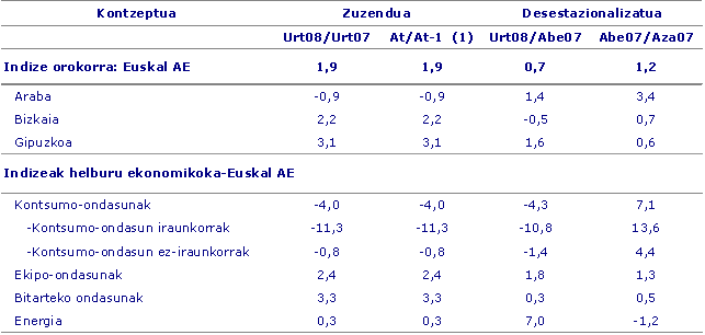 Sektoreen arabera, eta industri sektore nagusiak sailkatu ostean, 2008ko urtarrileko indizearen bilakaera hazi egin da ekipamendu ondasunetan (%2,4), tarteko ondasunetan (%3,3), eta energian (%0,3), 2007ko urtarrilaren aldean. Kontsumo-ondasunak %-4,0 jaitsi dira; kontsumo-ondasun ez-iraunkorren prezioak %-0,8 jaitsi ziren, eta kontsumo-ondasun iraunkorrenak %-11,3.
