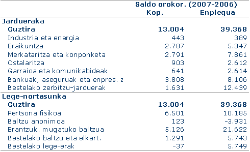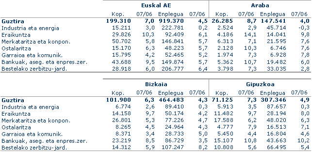 Herrialde-eremuka, Gipuzkoan erkidegoko batez bestekoaren gainetik ibili da enplegu-sortzea (%4,9ko tasa); Bizkaian %4,3 eta Araban %4,0. Gipuzkoan “Bankuak, aseguruak eta enpresa-zerbitzuak” sektorea da liderra enplegu-hazkundean, %10,2ko tasarekin; euskal batez bestekoaren gainetik daude, baita ere, Eraikuntza (%8,0), Ostalaritza (%7,1) eta Merkataritza eta Konponketa (%6,3). Araban Eraikuntzako hazkunde-tasa nabarmentzen da (%9,8), eta negatiboa da Industria eta Energian (%-0,3). Bizkaiak euskal batez bestekoaren gaineko tasa du Bestelako zerbitzu-jardueretan (%8,2), gainerako guztietan azpitik dagoelarik, batez ere Bankuak, aseguruak eta enpresa-zerbitzuak sektorean (%3,5).