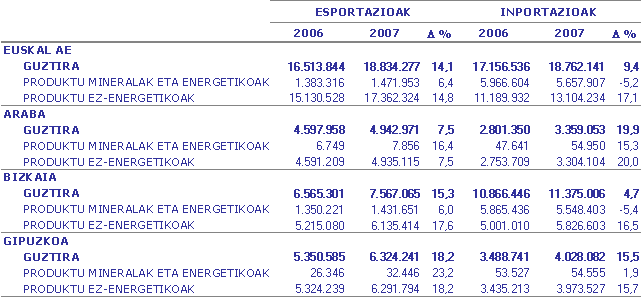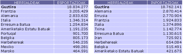 Herrialdeka, bostek jaso dituzte Euskal AEtiko esportazioen erdia baino gehiago: Frantzia (%17,0), Alemania (%15,1), Italia (%7,2), Erresuma Batua (%6,7), eta Estatu Batuak (%6,3). Modu berean, gure inportazioen erdia baino gehiago bost herrialdetatik datoz: Alemania (%15,3), Errusia (%14,8), Frantzia (%10,3), Italia (%7,3) eta Txina (%6,1).