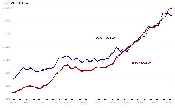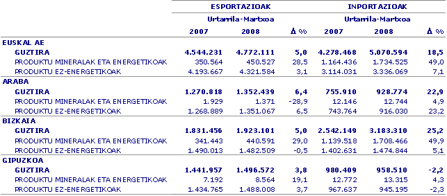 Europar Batasuna helburu duten esportazioak %4,1 hazi ziren 2007ko lehen hiruhilekoaren aldean. Nabarmentzekoak dira bai bolumen, bai urte arteko hazkundeagatik ondokoak: Belgika (%26,5), Portugal (%14,4) eta Polonia (%31,3); eusten diote Frantziak (%1,3), edo Erresuma Batuak (%-0,9), eta beheraka dauzkagu Italia (%-4,2) eta Alemania (%-2,1). 27-EBtik kanpo AEB eta Latinoamerikara egindako esportazioak aipatu behar, bietan %7,8ko hazkundea izan delarik.