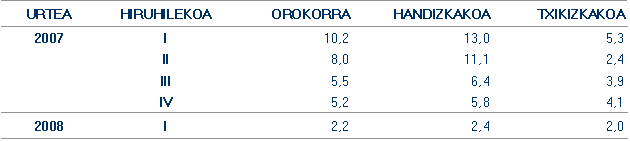 Araban, handizkako sektorearen salmentek bilakaera negatiboa izan dute (%-0,8), eta txikizkako merkataritzaren salmentek %1,7ko gehikuntza izan dute, termino nominaletan. Bizkaian, ordea, bi sektoreek hazkundea izan duten arren, handizkako sektorearena (%2,7) txikizkako merkataritzak izandakoa (%1,7) baino handiagoa izan da. Gipuzkoan txikizkako merkataritza %2,8 igo da eta handizkakoa %3,9.