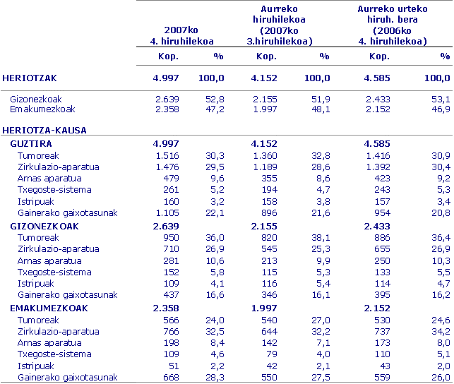 2007ko laugarren hiruhilekoan, Euskal AEn 4.997 lagun hil ziren, aurreko urteko aldi berean baino %9 gehiago, Eustaten datuen arabera. Lurraldez lurralde, Araban 577 lagun hil ziren, Bizkaian 2.823, eta Gipuzkoan 1.597.