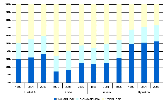 Hona hemen euskaldunik gehien duten eskualdeak: Bilbo Handia (207.659), Donostia-San Sebastián (133.389), Arabako Lautada (58.733) eta Urola-Kosta (51.659), biztanleriarik gehien dutenak. Gainera, 2001eko Biztanleria- Zentsuan igarritako joera mantendu egiten da: Euskaldunen kopuruaren hazkunderik handiena Araban gertatzen da, euskerarik gutxien egiten zen eskualdeetan; eta jaitsiera orokorra dago oso euskaldunak ziren inguruetan. Ehuneko 10 puntu baino gehiagoko hazkundea dute Arabako Ibarrek, Lautadak eta Errioxak. Bizkaian Enkarterrietan eta Bilbo Handian hazi da batik-bat euskaldunen kopurua, ia zazpi puntuz. Euskaldunen galera dago, 2001ean dagoeneko igartzen zen, Markina-Ondarroan (3,9 ehuneko puntu), Gernika-Bermeon (2,5), Urola-Kostan (2,4), Deba Goienean (1,8), Tolosaldean (1,8), Goierrin (1,4), Deba barrenean (1,3) eta Arratia-Nerbioin (1,2). Durangaldean, aurreko bost urtekoan bezalaxe, euskaldunen hazkundea dugu (1,4).