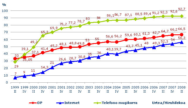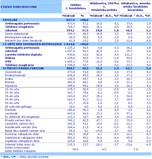 Jardueraren arabera, ikasleen arteko %96,3k erabiltzen du Internet; pertsona okupatuen artean, %66,9k, eta ez-aktiboen eta langabetuen artean %16,7k. 2007ko laugarren hiruhilekoaren aldean hazkunderik handiena, %9,8, ez-aktiboen eta langabetuen artean izan da; okupatuen artean %4,4 hazi da eta ikasleen artean %-1,9 jaitsi.