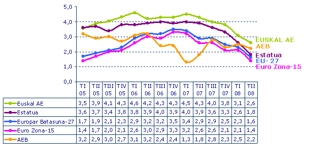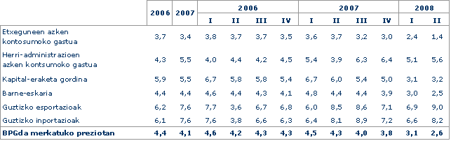 Zerbitzuen sektoreak BPGk baino tasa positiboagoa du, %3,4 hazi delarik; barruan, halere, ezberdinak izan dira jokaerak. Merkatuko zerbitzuak %2,7ko urte arteko hazkundea lortzera iritsi dira. Tasa hori BPGren hazkundearenaren antzekoa da. Ez-merkatuko zerbitzuek, berriz, hazkunde-erritmo handiari eutsi diote; urte artekoa aurreko hiruhilekoan bezalaxe hazi da, %6,5.